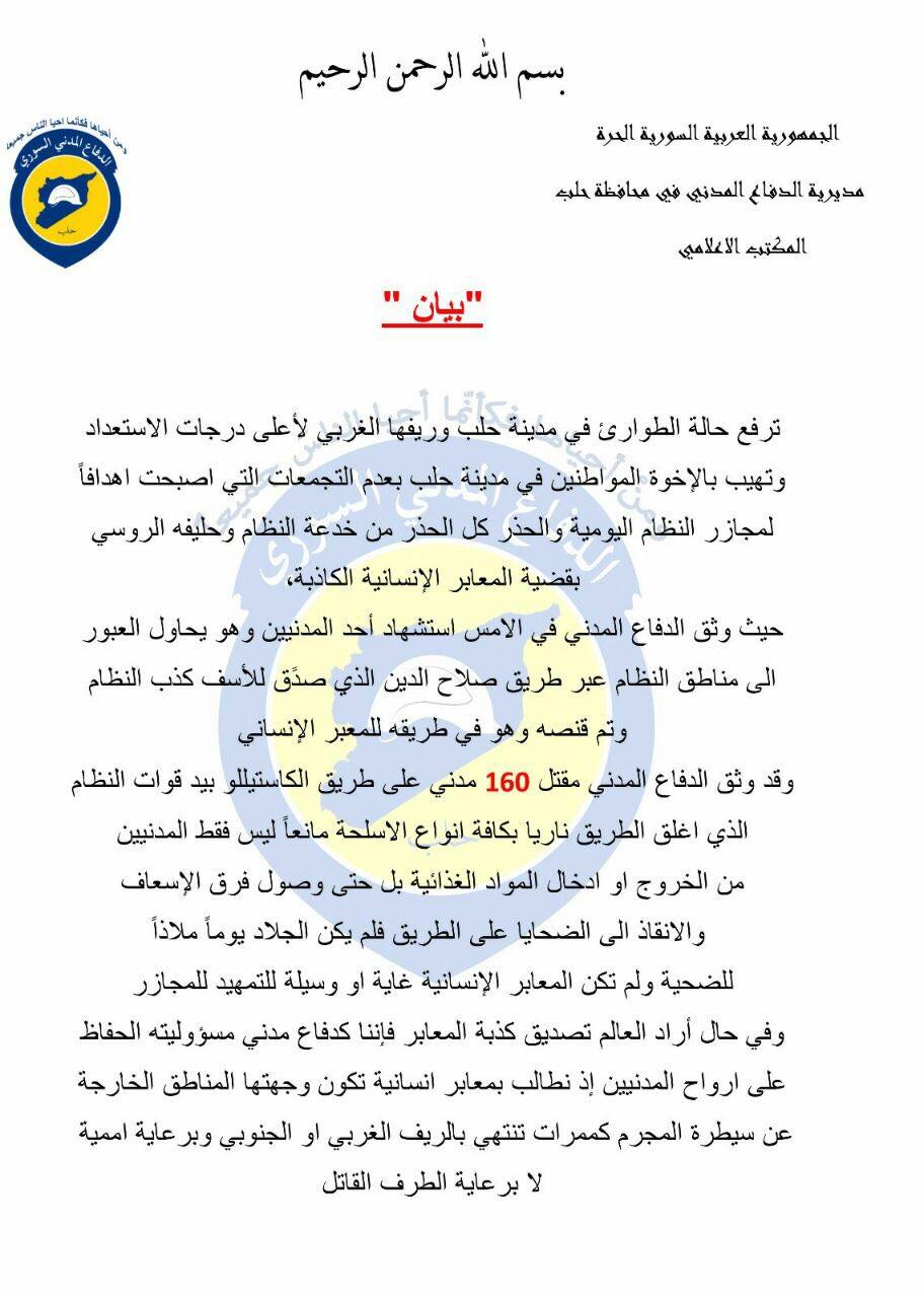 وبالمقابل كثف الطيران الحربي والمروحي غاراته بشكل جنوني حيث نفذ عشرات الغارات الجوية على أحياء حلب القديمة وتحديداً أحياء الشعار وباب الحديد والقاطرجي والمشهد وطريق الباب بالصواريخ والألغام البحرية واستهدفت صواريخ أرض أرض مقر الطبابة الشرعية موقعة شهيداً من الطبابة وعدة جرحى، كما نفذ غارات أخرى بنفس الوتيرة على قرية حور في ريف حلب الغربي ما أدّى إلى خروج مشفى “الهدى” عن الخدمة، وعلى قرى وبلدات أورم الكبرى و كفرناها و خان العسل.