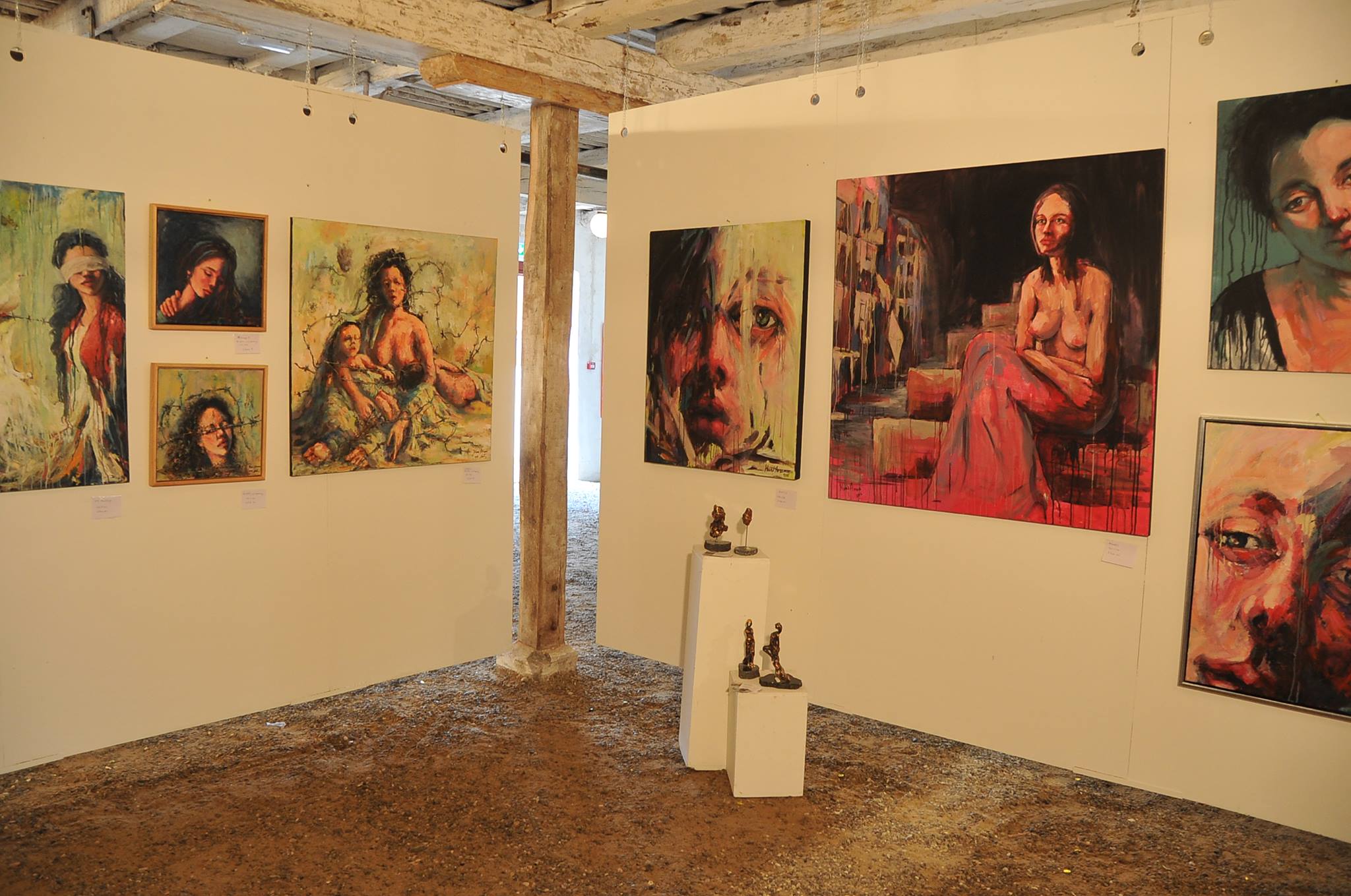 أما المشاركة الثانية للفنان هاني عرسان من مدينة القنيطرة بمجموعة لوحات كبيرة الحجم تجسد معاناة المرأة السورية في جميع حالاتها المآساوية من الجوع والخوف والتشرد .. اغتصاب .. قتل وهول ما تعانيها المرأة اولا”بسبب الحرب الدائرة و ثانيا” كونها أنثى كعنصر ضعيف تحت ظل مفهوم الذكورة حيث ضغط الالوان الباهتة في هذه اللوحات أعطت إحساس واضح بحجم المعاناة المرأة السورية دائما” من المجتمع والبيئة المحيطة بشكل عام و من الحرب في الوقت الحاضر في ظل غياب الرجل ( الزوج الاب الاخ …. ) .