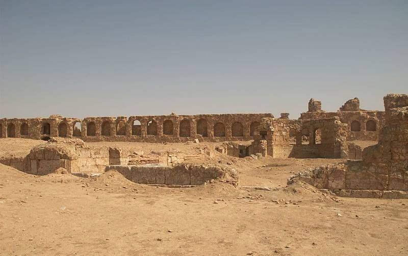 وإذا ترك الزائر المدينة من فتحة في الجنوب الشرقي من السور فإنه يلتقي ببقايا قصر أموي يُعتقد أنه قصر هشام بن عبد الملك على مسافة خمسين متراً من الكاتدرائية الكبرى ، والقصر مربع الشكل طول كل جانب منه قرابة ثمانين متراً ويحمي كل جانب برجان مستديران يرتكز كلٌ منهما على قاعدة مربعة والبناء مشيد من الآجر المجفف ، وتغطي جدرانه طبقة كلسية بيضاء وقد قامت بالكشف عنه بعثة ألمانية برئاسة ” اونو دورن” أواخر العام 1964وفيه باحة داخلية أما مدخل القصر فكان يقوم بين برجين مستديرين وهو يلفت النظر باتساعه غير المألوف البالغ 13 ،40 متراً وقد دُمِّر قصر هشام هذا كما دُمرِّت الكثير من المنشآت الأموية حينما استولى العباسيون على الحكم. وغير بعيد عن قصر هشام يقع قصر المنذر خارج السور الشمالي وهو ذا مسقط شبه مربع أبعاده 20× 17 وقد اختار المنذر بن الحارث لنفسه موقع ها القصر الذي بني بالحجر البللوري الجميل على طراز الكنائس ذات السطح،على شكل صليب إغريقي وتعلووسطه قبة كبيرة وأربع قبب صغيرة موزعة على زواياه وفي صدره حنِّية ومدخله يشبه ( النارتكس ) في الكنائس وهذا ما جعل العالِم الأميركي (هاورد بتلر) يظن أن المبنى عبارة عن كنيسة.
