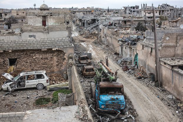 FILE – In this In this Friday, Jan. 30, 2015 file photo, rubble and damaged buildings are seen in the devastated Syrian city of Kobani. While Islamic State fighters have been forced to retreat from Kobani, the strategic town on Syriaís border with Turkey, they appear far from beaten in northern Iraq. Along the Kurdsí shifting front lines, itís a tenuous hold. Whichever side triumphs will determine whether Islamic State can use the main highway west to funnel weapons and reinforcements to their retreating comrades in Syria. (AP Photo, File)
