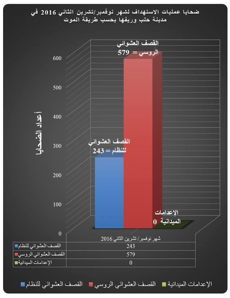 ضحايا عمليات الاستهداف لشهر تشرين الثاني 2016 في حلب وريفها بحسب طريقة الموت نشرت في:شؤؤن محلية - يناير 15, 20170 ضحايا عمليات الاستهداف لشهر تشرين الثاني 2016 في حلب وريفها بحسب طريقة الموت Share On Facebook Share On Twitter Share On Google+ Share On Pinterest