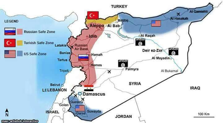 موقع ديبكا الاستخباراتي الإسرائيلي يضع خارطة حول المناطق الامنة التي أمر ترامب بإنشائها في سورية هي: