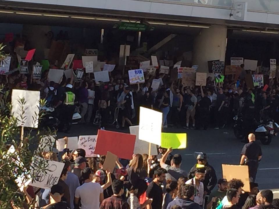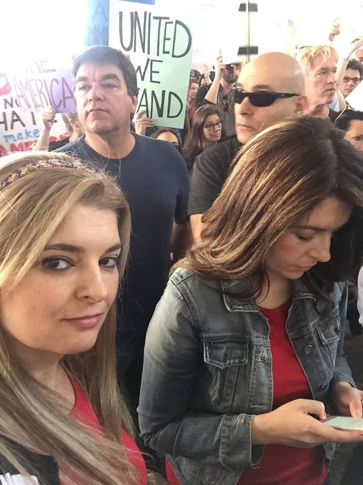 16467168_1282594428465313_303850700_nتقول لمى : خرجنا في الأمس شبابا ونساء وشيوخا وأطفال متوجهين جميعا إلى مطار لوس انجلس الدولي حيث يحتجز فيه عدد من اللاجئين السوريين و المهاجرين الجدد، فوقفنا بالآلاف نهتف بصوت واحد مطالبين فيه بإخلاء سبيل اللاجئين السوريين فوراً.