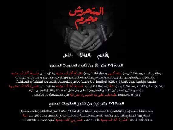 يعتبر التحرش الجنسي جريمه وفقاً للقانون المصري يحاكم مرتكبيها بمواد قانونيه سواء كان لفظياً أو لمسياً أو عن طريق الهاتف النت بالسجن ٦ أشهر ألي ٥ سنوات بالأضافه الي غرامه تصل أحياناً الي ٥٠ ألف جنيه مصري ..