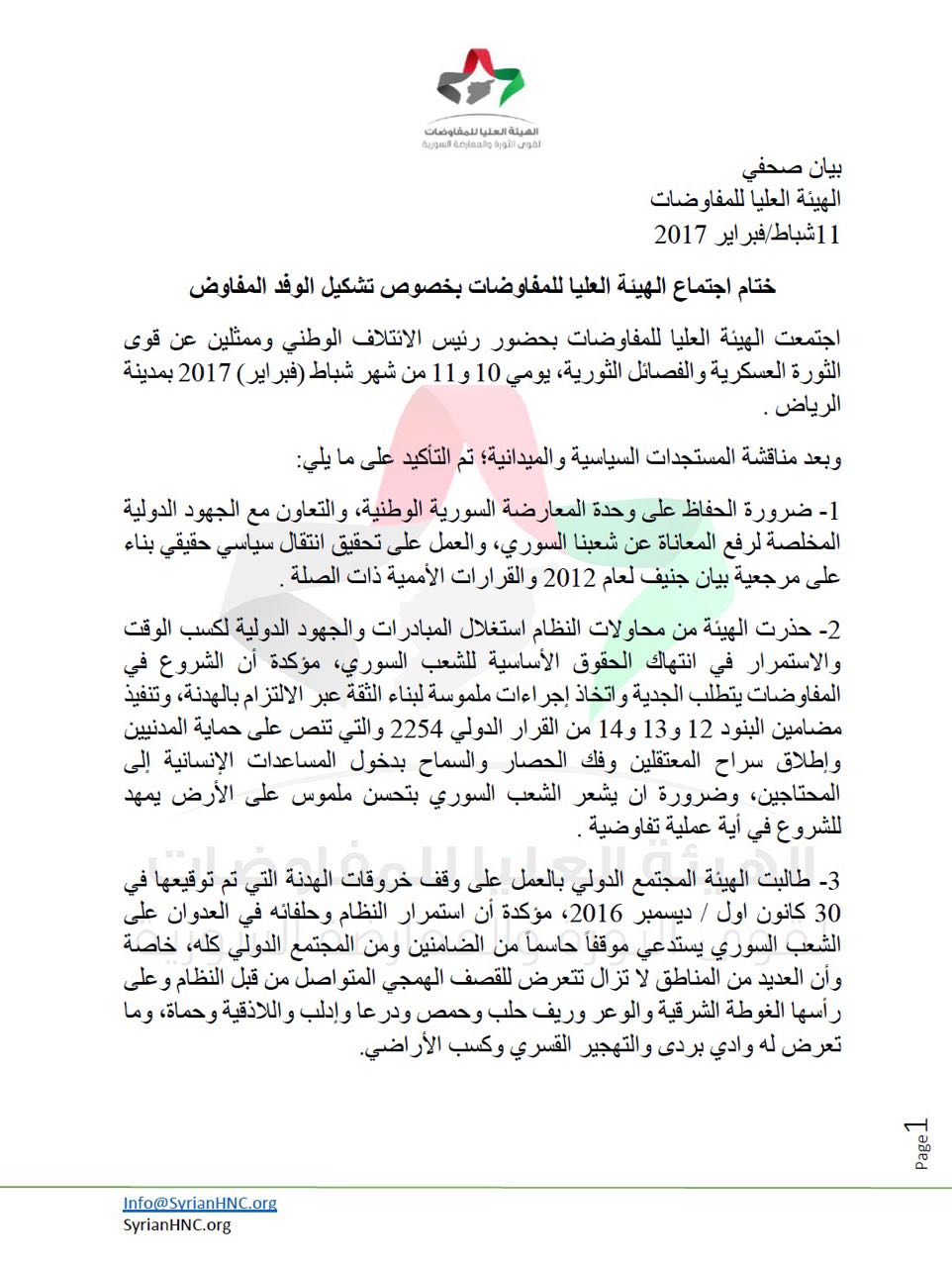 بيان صحفي ــ الجبهة العليا للمفاوضات .. نشرت في:شؤؤن محلية - فبراير 12, 20170 Share On Facebook Share On Twitter Share On Google+ Share On Pinterest