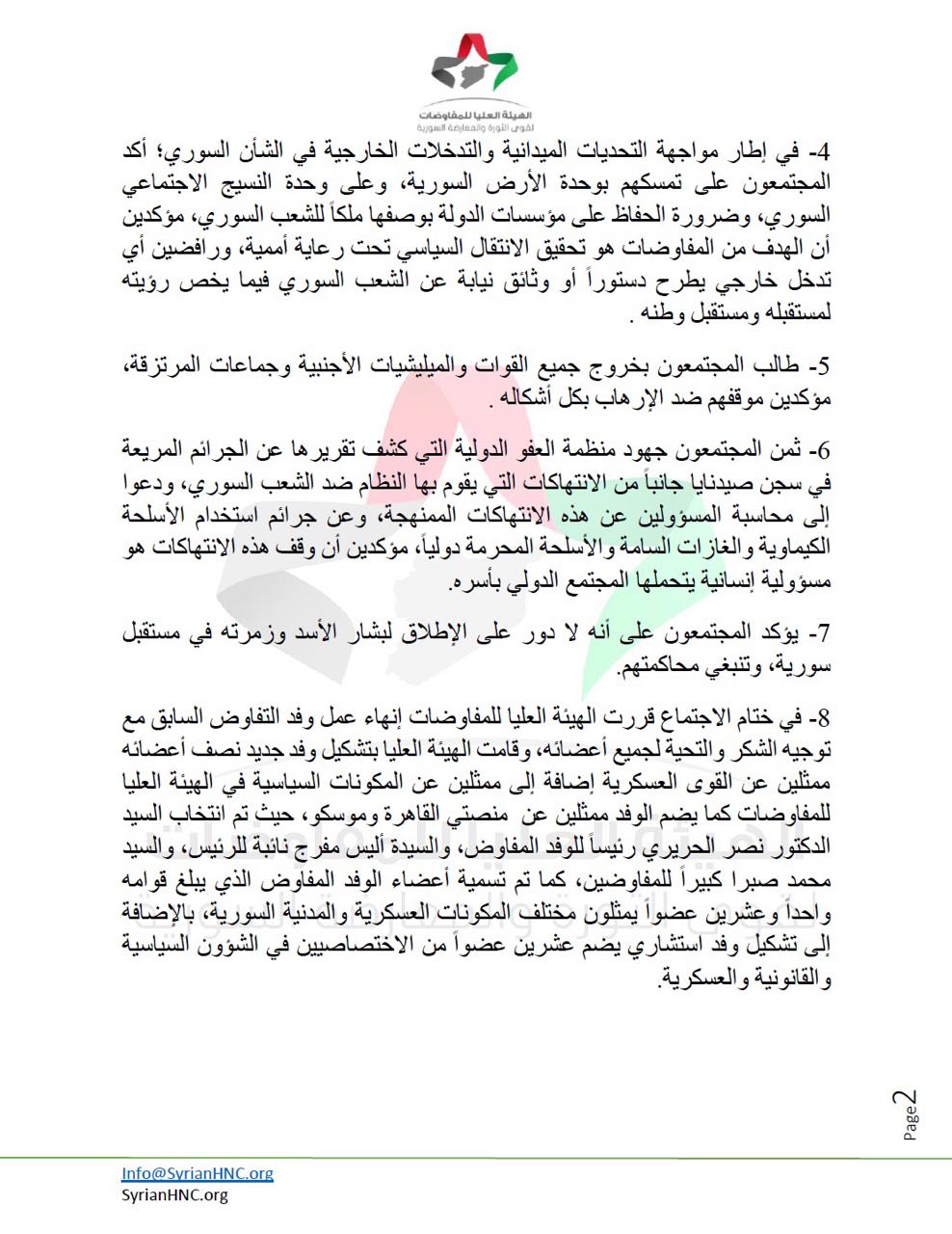 8- في ختام الاجتماع قررت الهيئة العليا للمفاوضات إنهاء عمل وفد التفاوض السابق مع توجيه الشكر والتحية لجميع أعضائه، وقامت الهيئة العليا بتشكيل وفد جديد نصف أعضائه ممثلين عن القوى العسكرية إضافة إلى ممثلين عن المكونات السياسية في الهيئة العليا للمفاوضات كما يضم الوفد ممثلين عن منصتي القاهرة وموسكو، حيث تم انتخاب السيد الدكتور نصر الحريري رئيساً للوفد المفاوض، والسيدة أليس مفرج نائبة للرئيس، والسيد محمد صبرا كبيراً للمفاوضين، كما تم تسمية أعضاء الوفد المفاوض الذي يبلغ قوامه واحداً وعشرين عضواً يمثلون مختلف المكونات العسكرية والمدنية السورية، بالإضافة إلى تشكيل وفد استشاري يضم عشرين عضواً من الاختصاصيين في الشؤون السياسية والقانونية والعسكرية.