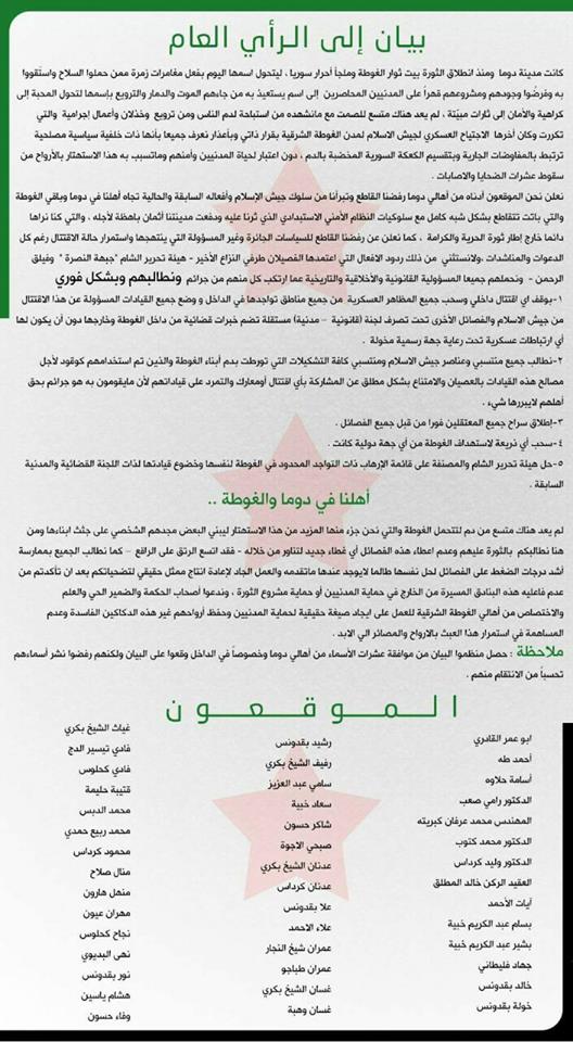 وبناء عليه نعلن نحن الموقعون أدناه من أهالي دوما رفضنا القاطع وتبرأنا من سلوك جيش الإسلام وأفعاله السابقة والحالية تجاه أهلنا في دوما وباقي الغوطة والتي باتت تتقاطع بشكل شبه كامل مع سلوكيات النظام الأمني الاستبدادي الذي ثرنا عليه ودفعت مدينتنا أثمان باهظة لأجله ، والتي كنا نراها دائما خارج إطار ثورة الحرية والكرامة ، كما نعلن عن رفضنا القاطع للسياسات الجائرة وغير المسؤولة التي ينتهجها واستمرار حالة الاقتتال رغم كل الدعوات والمناشدات ،ولانستثني من ذلك ردود الافعال التي اعتمدها الفصيلان طرفي النزاع الأخير – هيئة تحرير الشام “جبهة النصرة ” وفيلق الرحمن – ونحملهم جميعا المسؤولية القانونية والأخلاقية والتاريخية عما ارتكب كل منهم من جرائم ونطالبهم وبشكل فوري ..