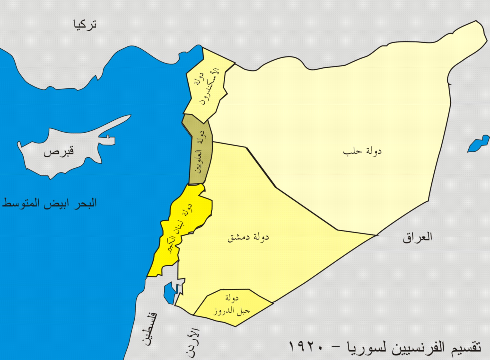 دولة دمشق (1920) – دولة حلب (1920) – دولة العلويين (1920) – دولة لبنان الكبير (1920) – دولة جبل الدروز (1921) – لواء الاسكندرون المستقل (1921)