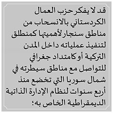 6- وفي العراق من المحتمل أنْ تشن تركيا عملية برية واسعة تستهدف معاقل حزب العمال الكردستاني في منطقة سنجار بموافقةٍ من الولايات المتحدة وتنسيقٍ ودعمٍ من البيشمركة الكردية (جناح مسعود البارزاني) لحرمان الحزب من موقع بديل أكثر أهمية في شن الهجمات ضد القوات والمدن في العمق التركي من معقله الرئيسي في جبل قنديل.