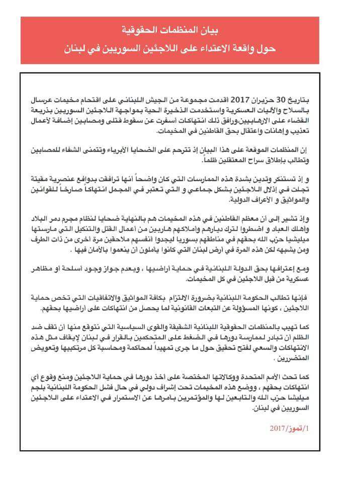 بيان منظمات المجتمع المدني حول واقعة الإعتداء على اللاجئين السوريين في لبنان نشرت في:شؤؤن محلية - يوليو 5, 20170 Share On Facebook Share On Twitter Share On Google+ Share On Pinterest