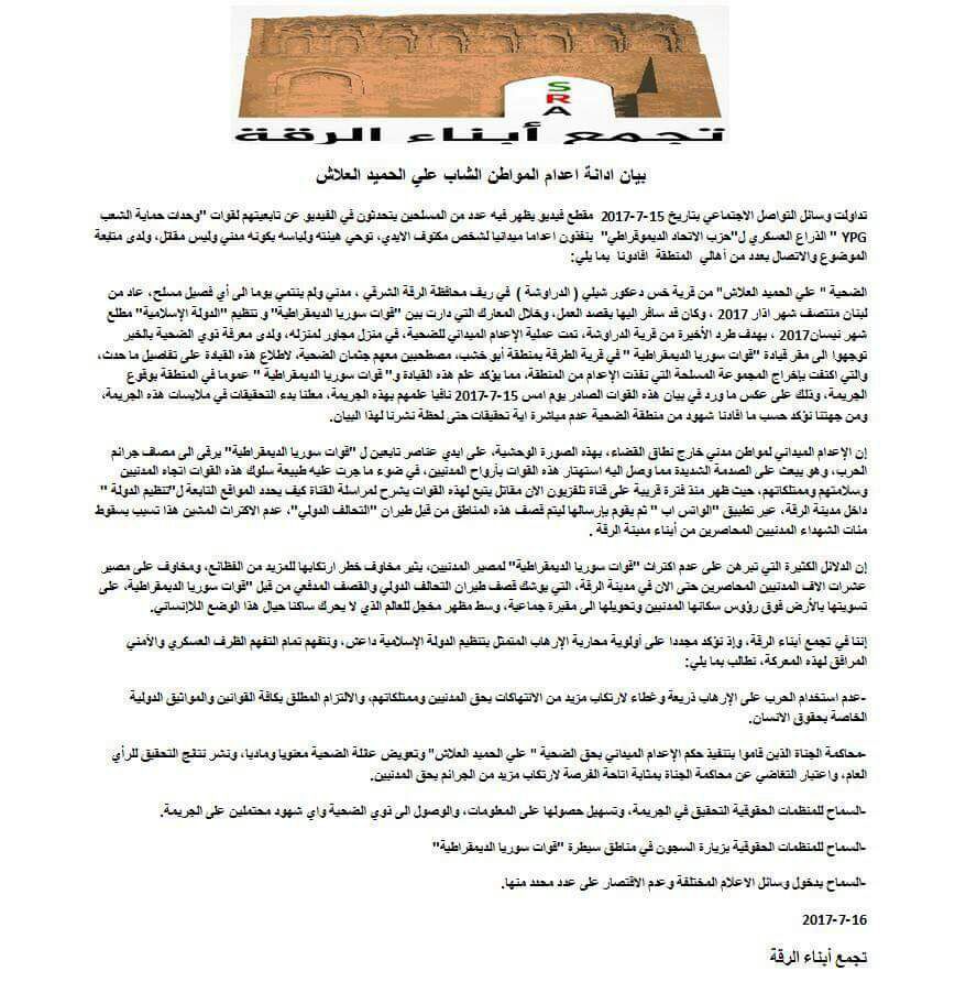 إن الإعدام الميداني لمواطن مدني خارج نطاق القضاء، بهذه الصورة الوحشية، على ايدي عناصر تابعين ل “قوات سوريا الديمقراطية” يرقى الى مصاف جرائم الحرب، وهو يبعث على الصدمة الشديدة مما وصل اليه استهتار هذه القوات بأرواح المدنيين، في ضوء ما جرت عليه طبيعة سلوك هذه القوات اتجاه المدنيين وسلامتهم وممتلكاتهم، حيث ظهر منذ فترة قريبة على قناة تلفزيون الان مقاتل يتبع لهذه القوات يشرح لمراسلة القناة كيف يحدد المواقع التابعة ل”تنظيم الدولة الاسلامية” داخل مدينة الرقة، عبر تطبيق “الواتس اب ” ثم يقوم بإرسالها ليتم قصف هذه المناطق من قبل طيران “التحالف الدولي”، عدم الاكتراث المشين هذا تسبب بسقوط مئات الشهداء المدنيين المحاصرين من أبناء مدينة الرقة .