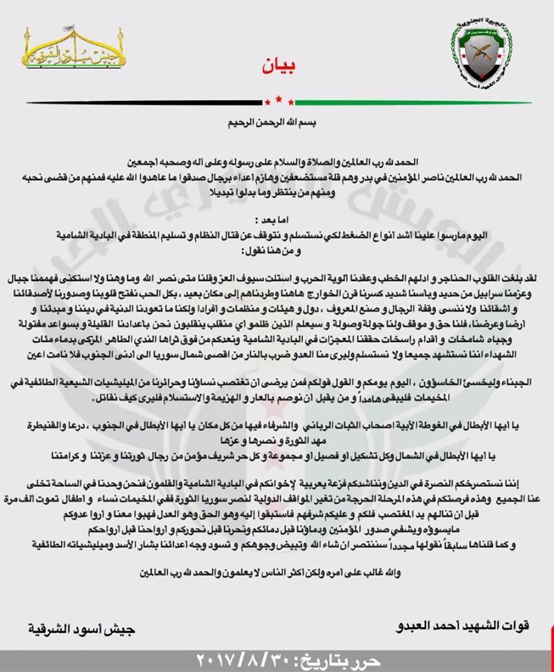 بيان: جيش اسود الشرقية نشرت في:شؤؤن محلية - سبتمبر 6, 20170 Share On Facebook Share On Twitter Share On Google+ Share On Pinterest