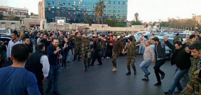 ككل الطغاة، كان نظام الأسد جاهزًا، بالطبل والزمر، ليعلن أن الضربات العسكرية التي وجهتها الولايات المتحدة الأميركية وبريطانيا وفرنسا، فجر اليوم السبت، على مواقعه، لم تنل منه؛ حيث استقدم في الصباح الباكر، رجالَ أمنه إلى ساحة الأمويين، ليتراقصوا ويتمايلوا أمام مبنى تلفزيونه، ليكون يسيرًا على إعلامه المشاركة في مراسم “الزفة”.