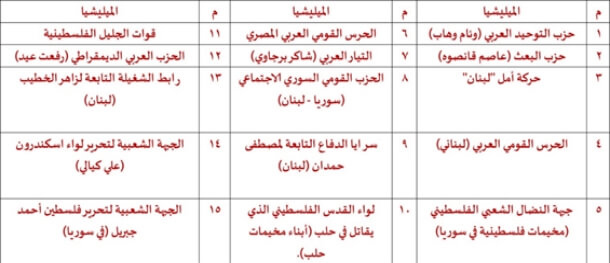 2– ميليشيات المرتزقة بدافع أيديولوجي قومي كعناصر الأحزاب القومية العربية -علماً أنها رمزية وقليلة نوعاً ما نتيجة سوء تنظيم وفق ما قاله النائب عن حزب البعث في البرلمان اللبناني عاصم قانصو- أهمها: