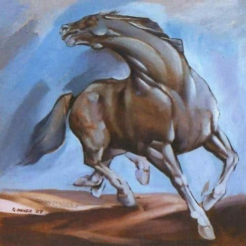 ما يلفت النظر في الكثير من لوحات جورج -أيضًا- توظيفه للجواد في أوضاع رمزية مختلفة الدلالات والرموز، يكاد المشاهد يسمع صهيله، ويشعر بأنه يستعد للخروج من قيد اللوحة إلى فضاء الحرية. وقد شرح لي جورج ماهر ما يقصده من إعطاء دور رئيس للجواد في لوحاته: “لقد وجدت أن الفرس أو الجواد العربي يمثل عند العرب العديد من رموز القيم الأخلاقية، مثل الجرأة والتوثب والإقدام، ورفض الانصياع الأعمى، والحركة الدائبة، ما يعني توق الشخص العربي لكل تلك القيم”. وقبل أن أنهي المقال سألته هاتفيًا: هل تعتقد أن ثورتنا يمكن أن تزوي وتموت؟ فأجاب: “لم تقم الثورة السورية على يد حزب سياسي ما، وإنما نتيجة كم كبير من الظلم والاستبداد وحجب الحريات.. وهي لا تموت؛ لأنها تتغذى من ذاكرة الشعب ومن العنف الذي غلف حياته.. ذلك الماضي المأسوي سيبقى غذاء للثورة من أجل تحقيق مستقبل تسود فيه الحرية والديمقراطية والمواطنة المتساوية في الحقوق والواجبات للشعب كله”.