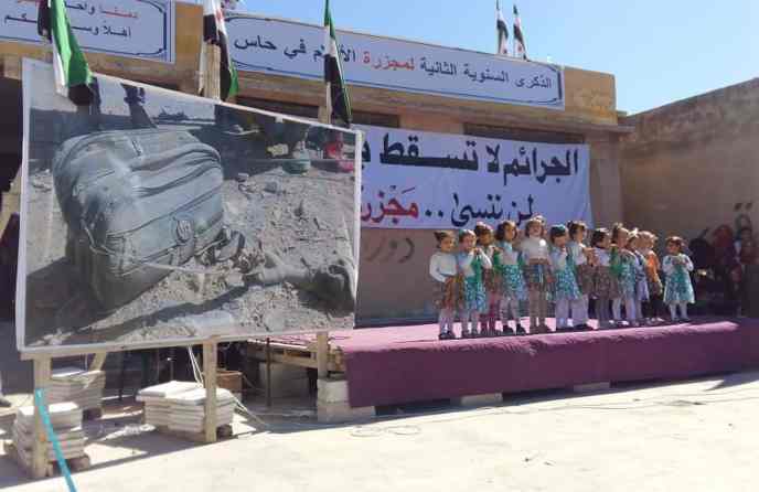 أحيَت فعاليات مدنيّة في بلدة حاس بريف إدلب الجنوبي، يوم أمس السبت، الذكرى السنوية الثانية لـ (مجزرة الأقلام) التي ارتكبتها طائرات قوات النظام، بقصف مجمّع مدرسي في تشرين الأول/ أكتوبر 2016، وراح ضحيتها 36 مدنيًا، بينهم 17 طالبًا ومعلمتان وطبيب وأكثر من 116 مصابًا، بينهم من بُترت أطرافه، وذلك بحضور طلاب المدرسة الذين نجوا من المجزرة وذويهم، والعديد من المنظمات وهيئات المجتمع المدني والشرطة الحّرة، وبعض الشخصيات من مديرية التربية الحرّة.