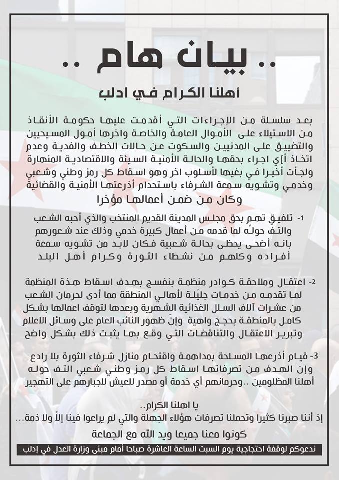 دعوة لوقفة احتجاجية في إدلب تنديدًا بتجاوزات “حكومة الإنقاذ”