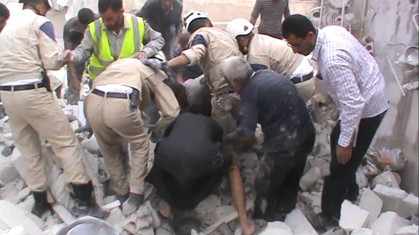 وأصيب في الغارتين أربعة متطوعين من الدفاع المدني في المدينة، في حين ارتقى شهداء وجرحى جراء القصف وغارات الطيران الحربي والبراميل المتفجرة.