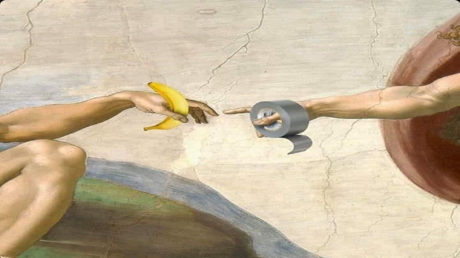 وتحولت فكرة الموزة مادة للتهكم والسخرية والاستهجان وشتم الفن المعاصر. أحدهم صمم الموزة واللاصق، مع لوحة “خلق آدم” لمايكل انجلو. وسنشهد لاحقاً الكثير من الإشارات إلى هذا العمل التافه…