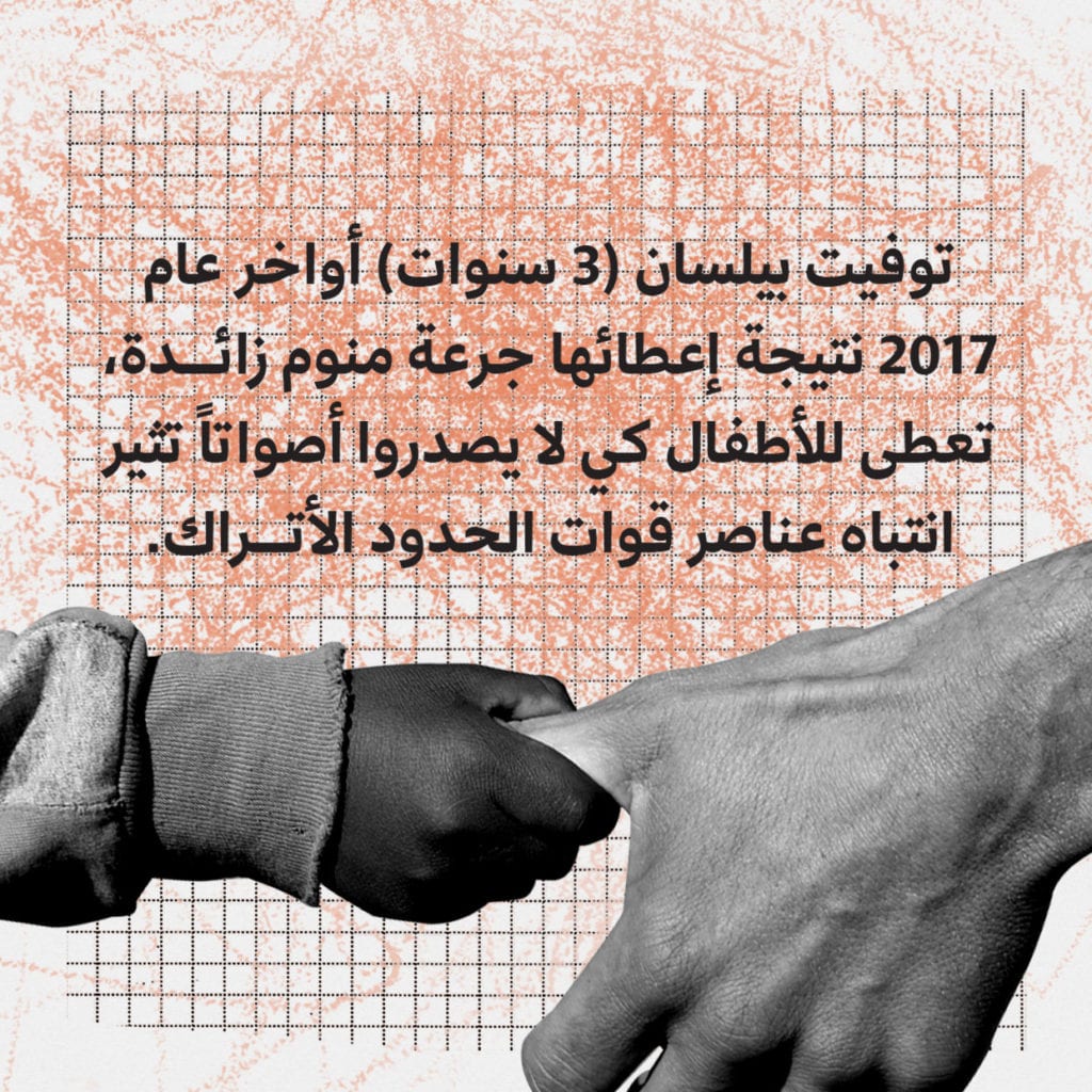أحمد، نازح من حمص إلى ريف إدلب، توفيت ابنة شقيقته بيلسان (3 سنوات) أواخر عام 2017 نتيجة إعطائها جرعة منوم زائدة، تعطى للأطفال الصغار من أجل تهدئتهم أثناء محاولات العبور، كي لا يصدروا أصواتاً تثير انتباه عناصر قوات الحدود الأتراك.