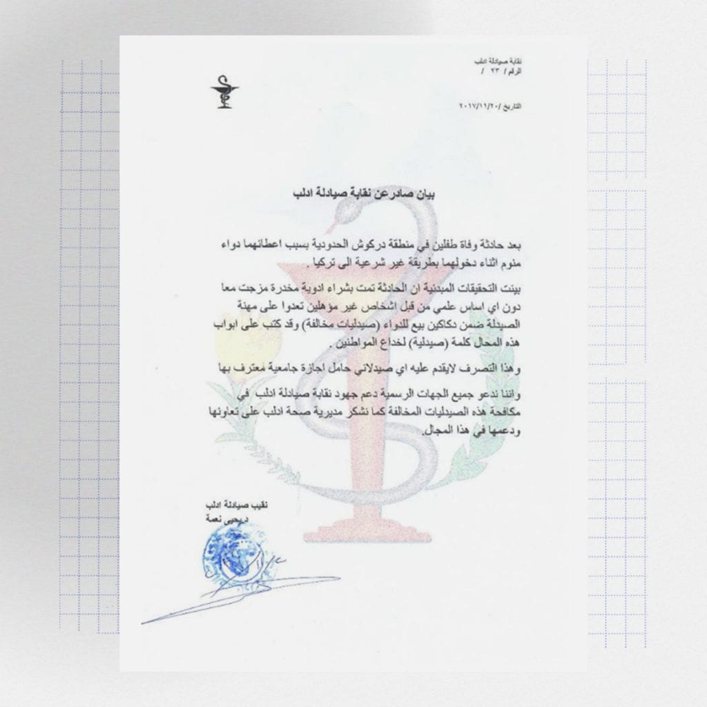 يقول أحمد إن ابنة شقيقته توفيت فعادوا بها ولم تكتمل عملية العبور، ويشير إلى أنهم راجعوا مكتب قطع الإيصالات وطالبوا بمحاسبة الصيدلاني الذي مزج المنوم بجرعة من شراب مضاد للسعال، فتم إرشادهم إلى محكمة تابعة للهيئة وتم رفع دعوى عليه، لكن بحسب أحمد لم تتخذ الهيئة أيّ إجراء ضده وبقيت صيدليته مفتوحة.
