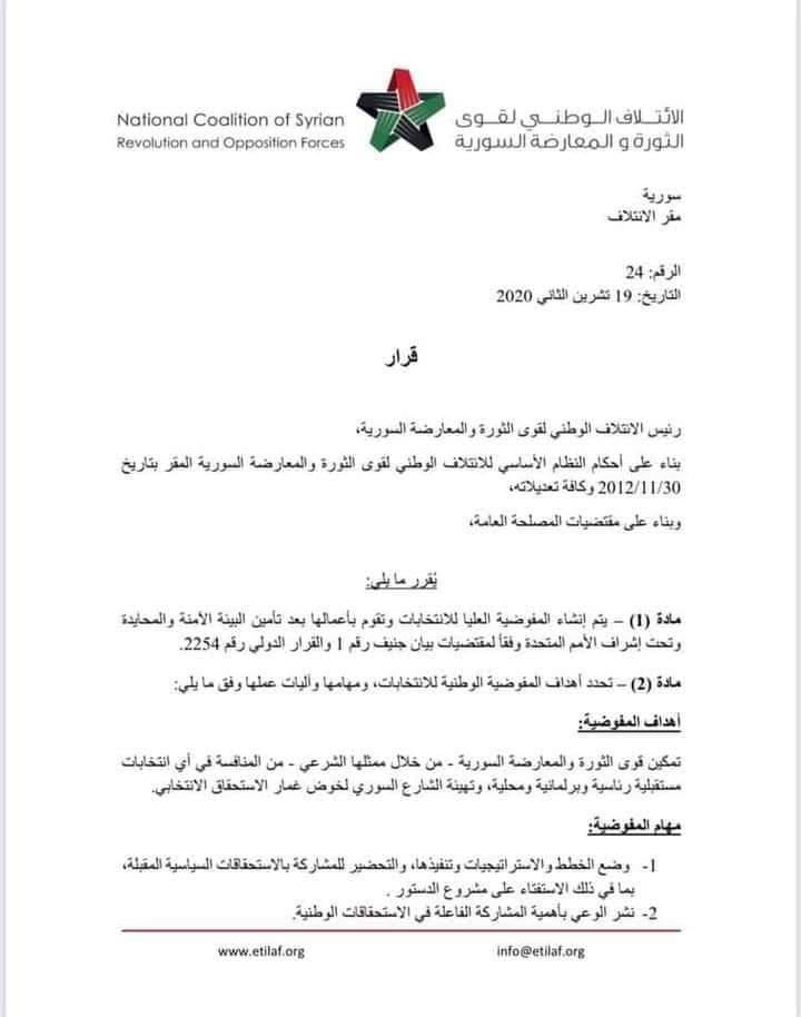 القرار (الإشكالي) الصادر أمس الخميس تحت رقم (24)، غير منشور على معرفات الائتلاف على وسائل التواصل الاجتماعي وموقعه الرسمي أو منشور قبل أن يُحذف.