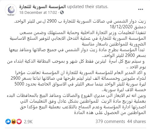 وقالت المؤسسة في بيان عبر صفحتها الرسمية في “فيس بوك“، الجمعة 18 من كانون الأول، “تبدأ المؤسسة بطرح مادة زيت دوار الشمس في جميع صالاتها ومنافذ بيعها بسعر 2900 لليتر الواحد”.