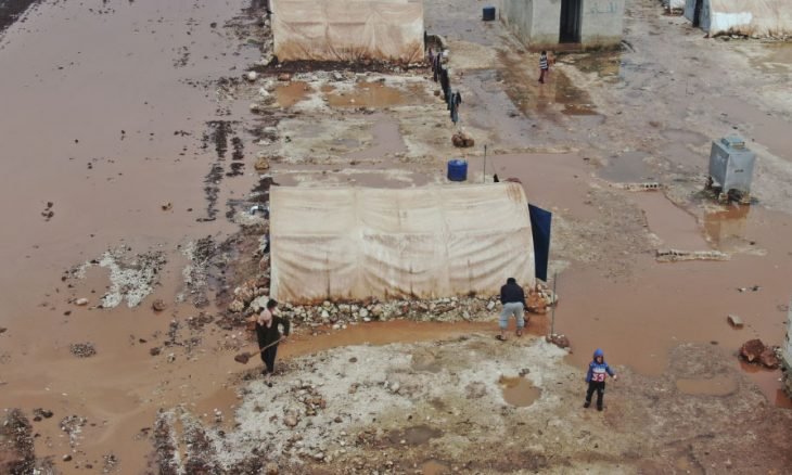 وسط أمطار وفيضانات متجددة، تضرب مخيمات النازحين في ريف إدلب، ما أدى لتشكل برك طينية تسببت بانهيار خيم أسفر عن وفاة طفل وإصابة ثلاثة آخرين، جدد الطيران الحربي الروسي، الثلاثاء، غاراته على مواقع متفرقة في البادية السورية مستهدفاً تنظيم «الدولة» فيما تواصل قوات النظام السوري، قصفها المدفعي والصاروخي على قرى وبلدات ريف إدلب بينما استحدث الجانبان التركي والروسي نقاطاً عسكرية جديدة، في ريف إدلب شمال غربي سوريا.