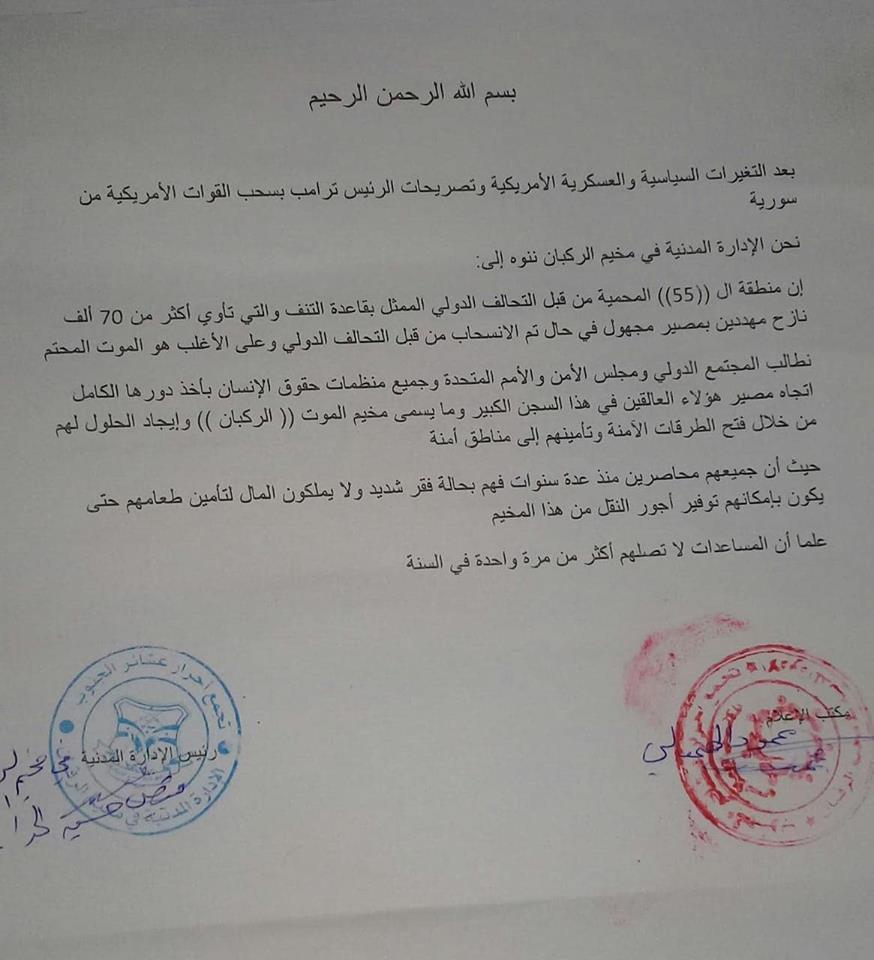 وجّه السوريون العالقون في مخيم الركبان الحدودي، نداءً إلى المجتمع الدولي، والأمم المتحدة وهيئاتها، وكافة المنظمات الحقوقية، من أجل إيجاد حل لهم، من خلال فتح طرق آمنة وإخراجهم إلى مناطق…