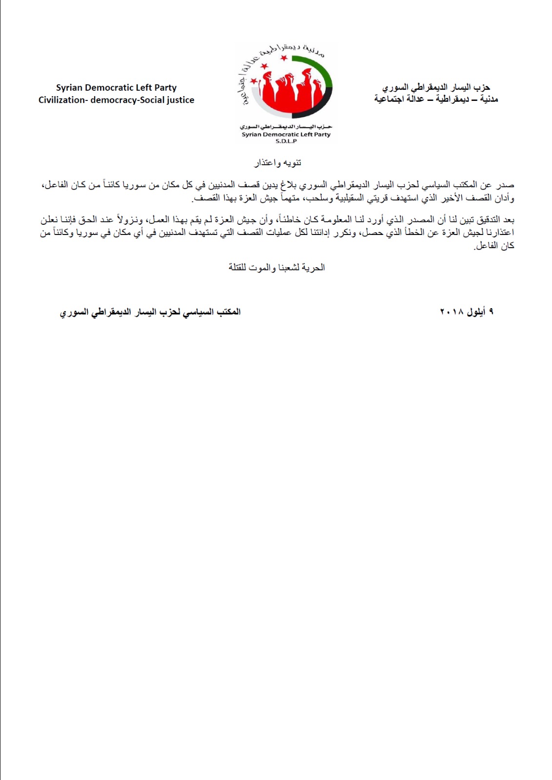 صدر عن المكتب السياسي لحزب اليسار الديمقراطي السوري بلاغ يدين قصف المدنيين في كل مكان من سوريا كائناً من كان الفاعل، وأدان القصف الأخير الذي استهدف قريتي السقيلبية وسلحب، متهماً…