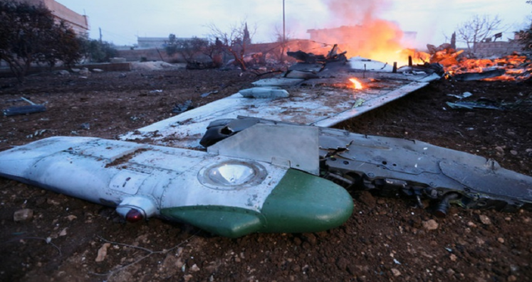 أسقط المقاتلون المقاتلة الطائرة فوق محافظة إدلب شمال غرب سورية، وقتلوا طيارها. 3 شباط/ فبراير 2018، يتصاعد الدخان من موقع الطائرة المقاتلة (سو-25) الروسية التي سقطت في سراقب، سورية. عمر…