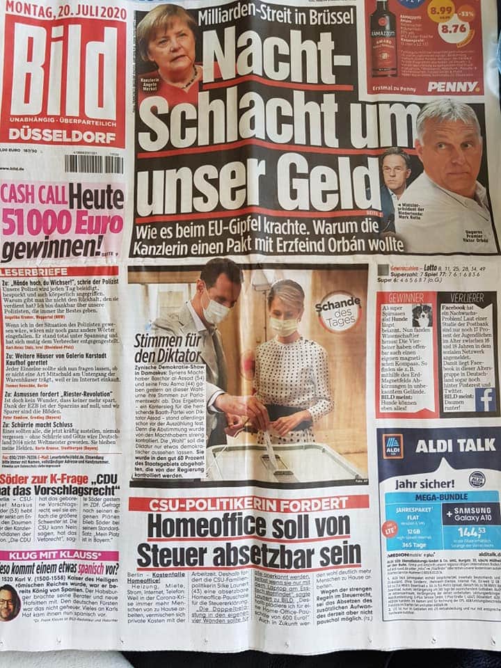 صحيفة بلد الألمانية في مانشيت فضيحة اليوم … نشرت صحيفة بلد الألمانية في صفحتها الاولى وتحت عنوان “اصوات للدكتاتور – إستعراض ساخر للديمقراطية في دمشق”. ووصفت انتخابات مجلس الشعب “العشب”…